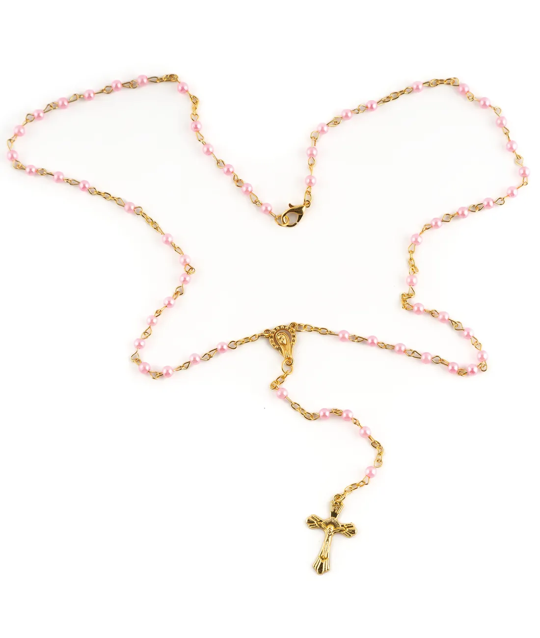 Růženec v lahvičce s křížem Svatého otce Benedikta v dárkové lahvičce se zlatým uzávěrem. Velikost křížku je 4 cm, barva drobných korálků je růžová.