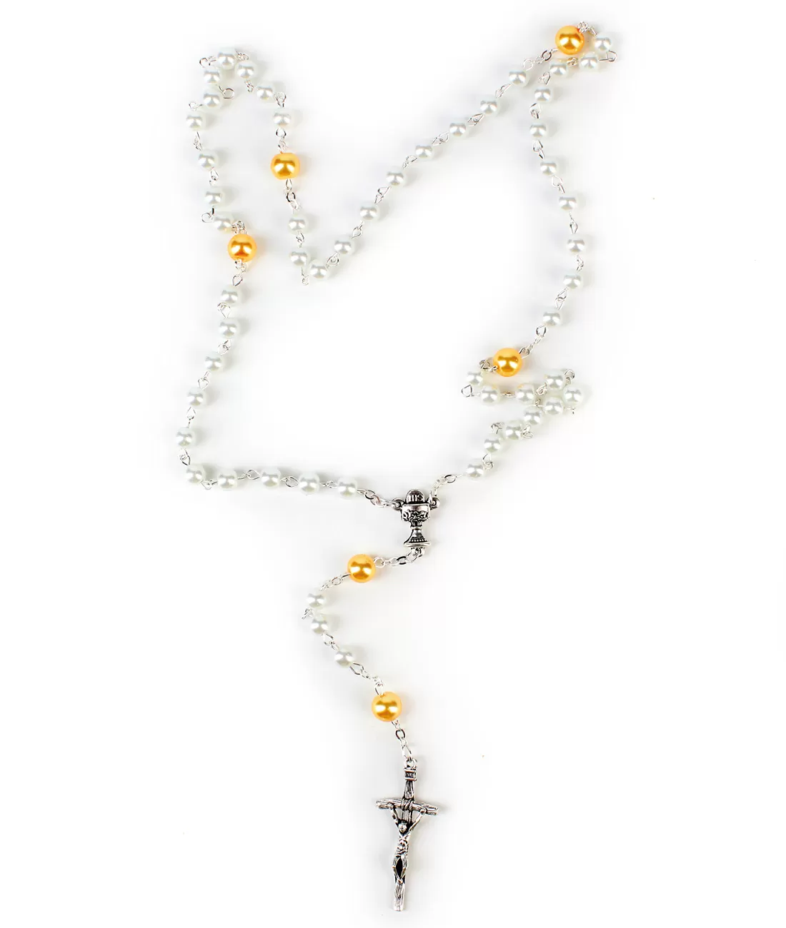 Krásný růženec z bílých perel, s kalichem a stříbrným křížkem v dárkové krabičce.