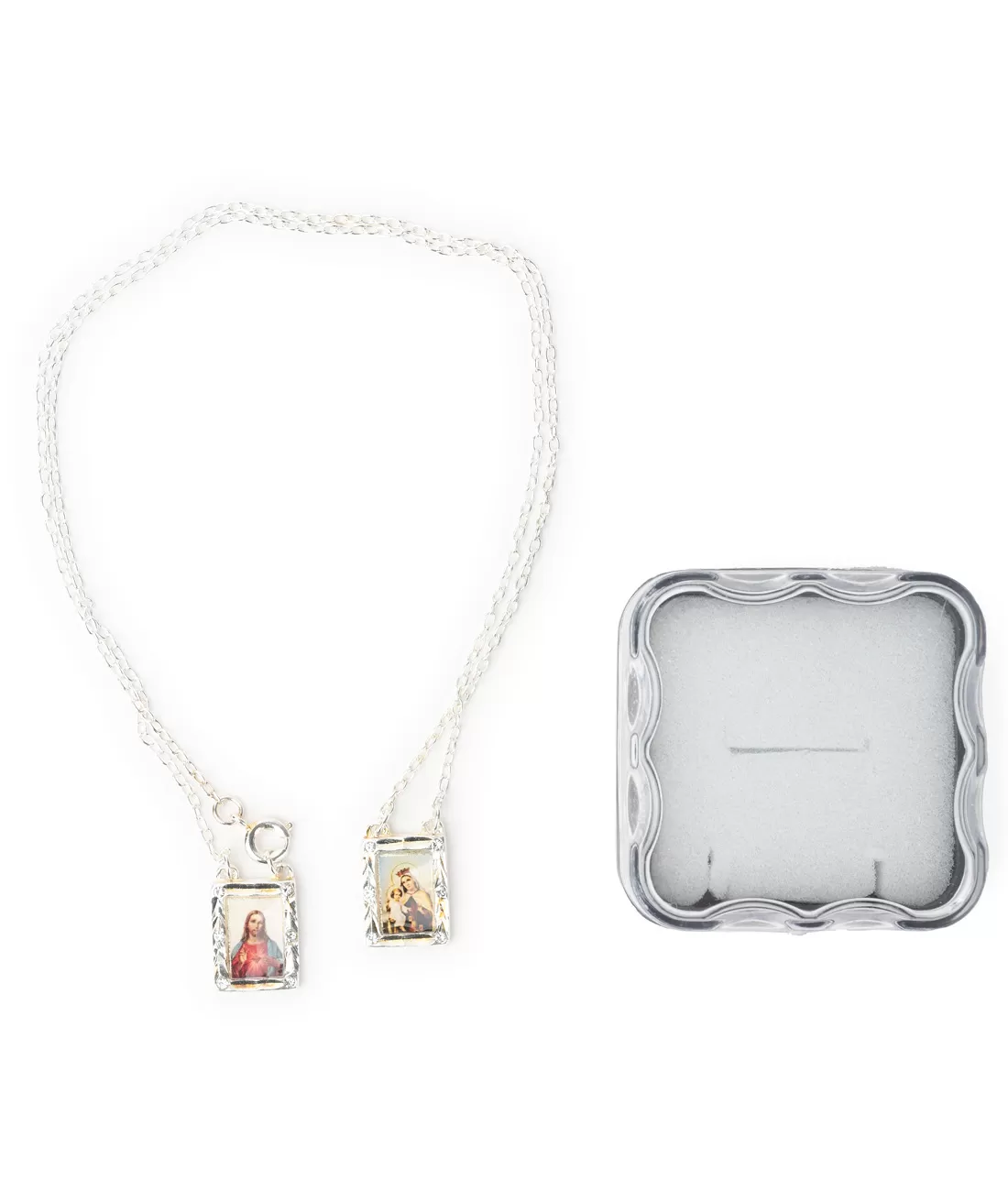Škapulíř Panny Marie Karmelské vyrobený z kovu stříbrné barvy na jemném kovovém řetízku v dárkové krabičce.