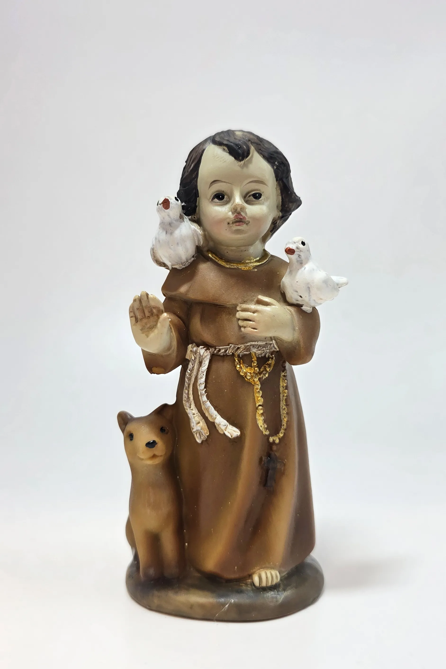Kolorovaná soška svatého Františka z Assisi o velikosti 10 cm. Sv. František z Assisi byl synem bohatého obchodníka v Assisi a z lásky ke Kristu všechno opustil. V době, kdy se materialismus rozrůstal i v údech Církve, začal ji František obnovovat nastoupením cesty v absolutní chudobě a životem podle evangelních rad. Založil nový řád "Menších bratří" (Minoritů) i jeho františkánské větve pro ženy a laiky žijící ve světě. Prioritou a nejvyšší hodnotou v jeho životě byla LÁSKA. S ní souvisel …i jeho soulad s přírodou. Jeho nejhlubší láska k Spasiteli a touha po spáse duší byla doplněna darem stigmat, která ho ještě více připodobnila ke Kristu. Zemřel ve věku 44 let. Je patronem Itálie (od r.1939), Assisi, Filipín; Katolické akce (1939); ekologie (1980) a ochránců přírody, chudých; kupců, krejčích, tkalců, skautských vlčat, tapetářů; vzýván proti bolestem hlavy, proti moru.