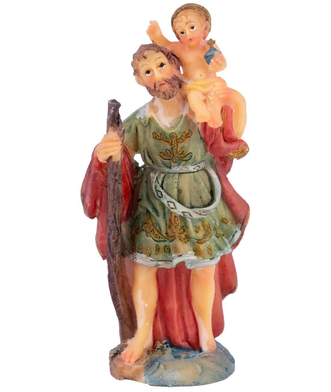 Kolorovaná soška svatého Kryštofa o velikosti 8 cm. Svatý Kryštof je patronem motoristů a všech cestujících, letců, lodníků, námořníků, obchodníků, atletů, lékařů, horníků, tesařů, kloboučníků, barvičů, knihařů, zahradníků, dětí; vzýván je při nepříznivém počasí, proti nákazám a živelným pohromám i proti náhlé a nekající smrti