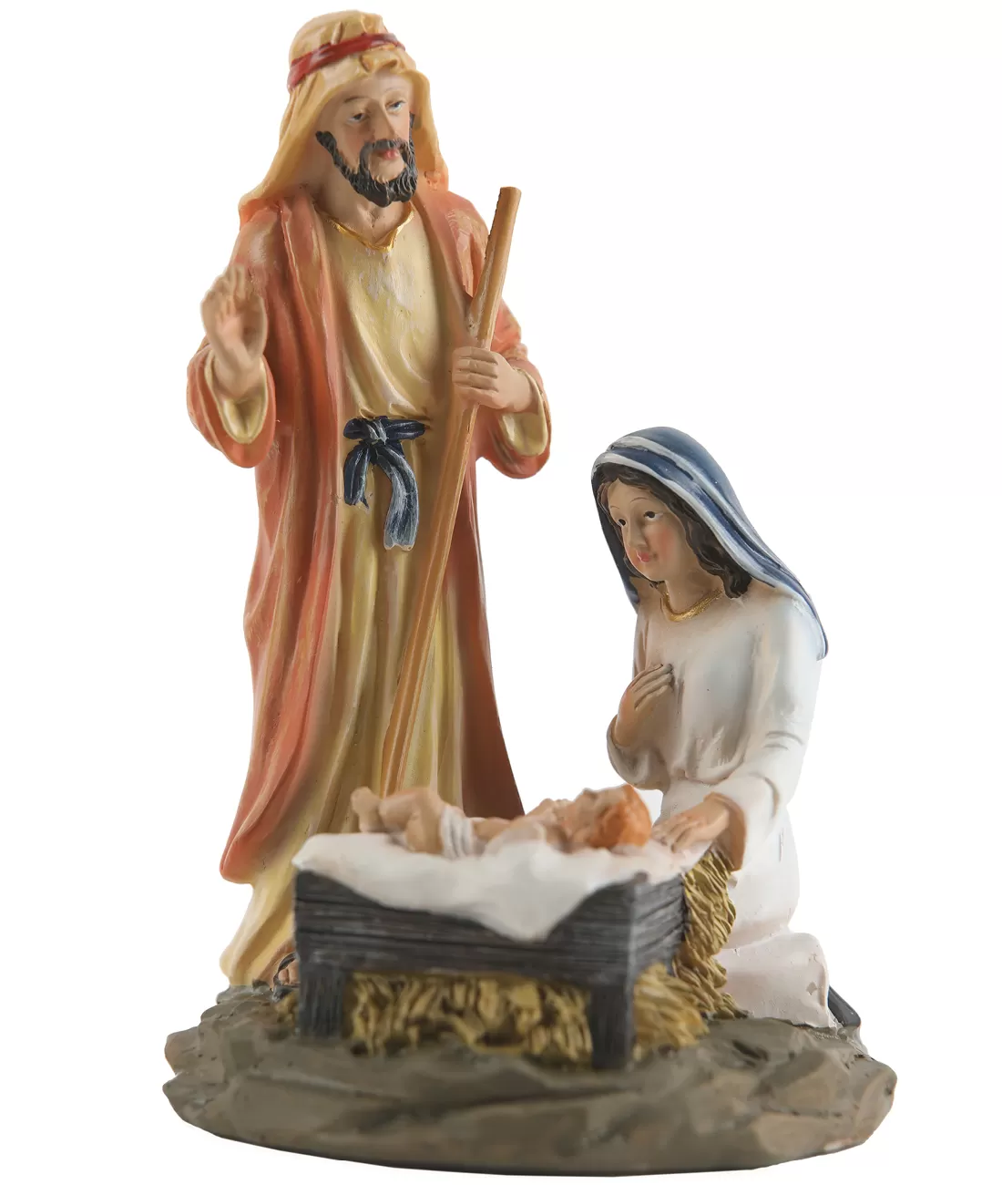 Plastika Svaté rodiny - Josefa, Marie a Ježíška vyrobená z kolorované umělé pryskyřice. Vysoká 15 cm.