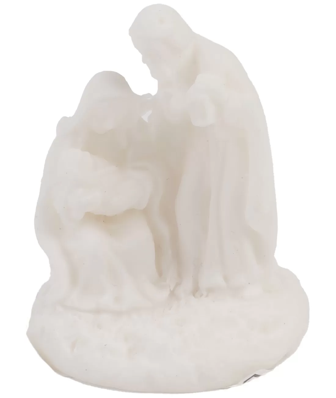 Drobná plastika Panny Marie a Josefa s Ježíškem z bílého alabastru o velikosti 4,5 cm.