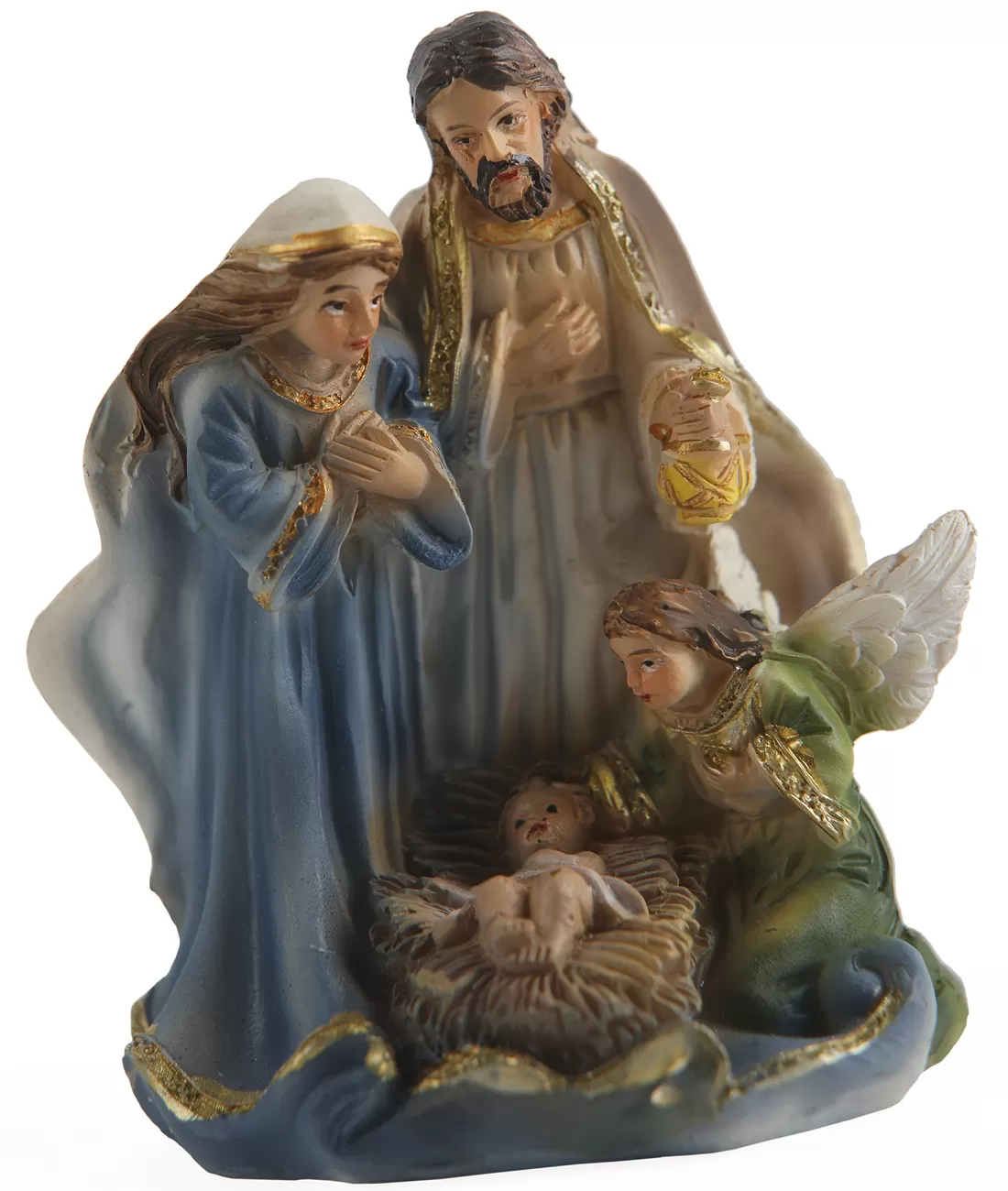 Barevná plastika Panny Marie, Josefa a Ježíška s klečícím andělem vysoká 8 cm.