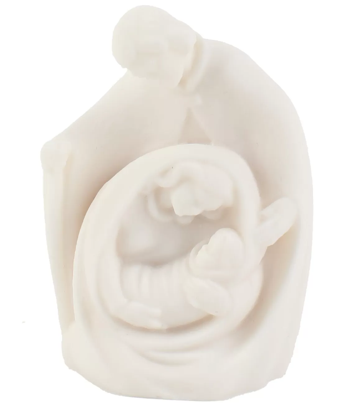 Drobná plastika Panny Marie, Josefa s Ježíškem z bílého alabastru o velikosti 9 x 5,5 cm.