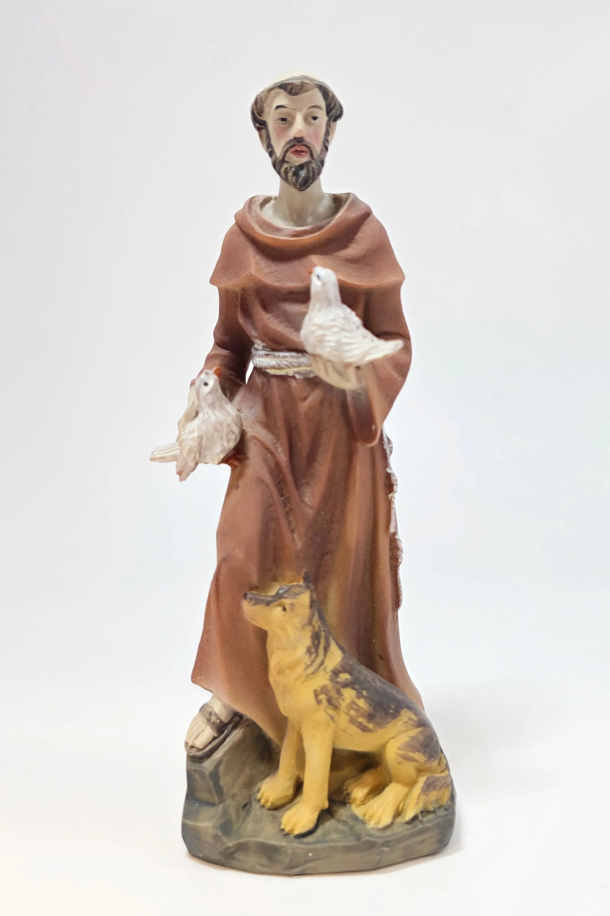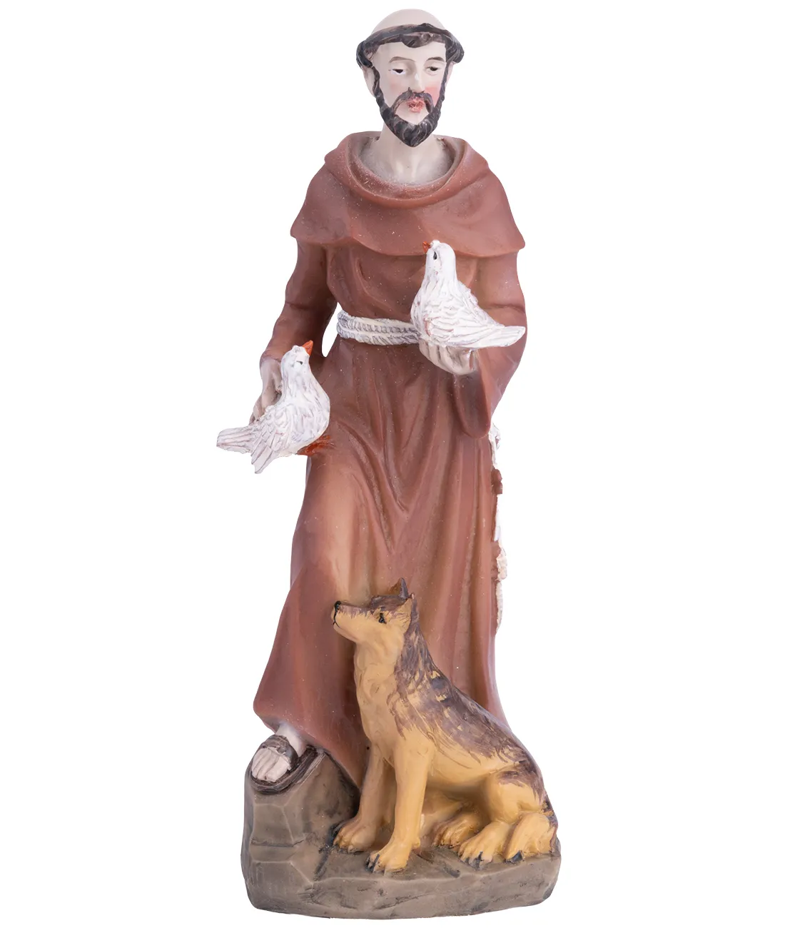 Kolorovaná soška svatého Františka z Assisi o velikosti 11,5 cm. Sv. František z Assisi byl synem bohatého obchodníka v Assisi a z lásky ke Kristu všechno opustil. V době, kdy se materialismus rozrůstal i v údech Církve, začal ji František obnovovat nastoupením cesty v absolutní chudobě a životem podle evangelních rad. Založil nový řád "Menších bratří" (Minoritů) i jeho františkánské větve pro ženy a laiky žijící ve světě. Prioritou a nejvyšší hodnotou v jeho životě byla LÁSKA. S ní souvisel …i jeho soulad s přírodou. Jeho nejhlubší láska k Spasiteli a touha po spáse duší byla doplněna darem stigmat, která ho ještě více připodobnila ke Kristu. Zemřel ve věku 44 let. Je patronem Itálie (od r.1939), Assisi, Filipín; Katolické akce (1939); ekologie (1980) a ochránců přírody, chudých; kupců, krejčích, tkalců, skautských vlčat, tapetářů; vzýván proti bolestem hlavy, proti moru.