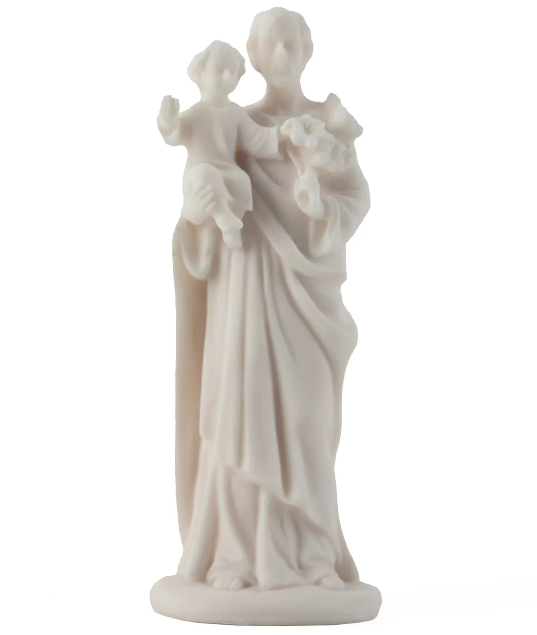 Soška svatého Josefa s malým Ježíšem v náručí vyrobená z bílého alabastru.