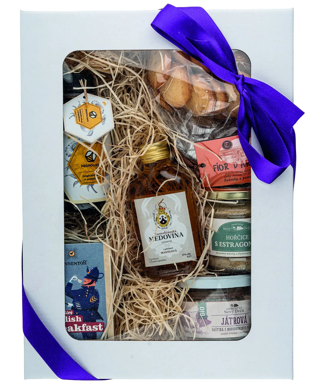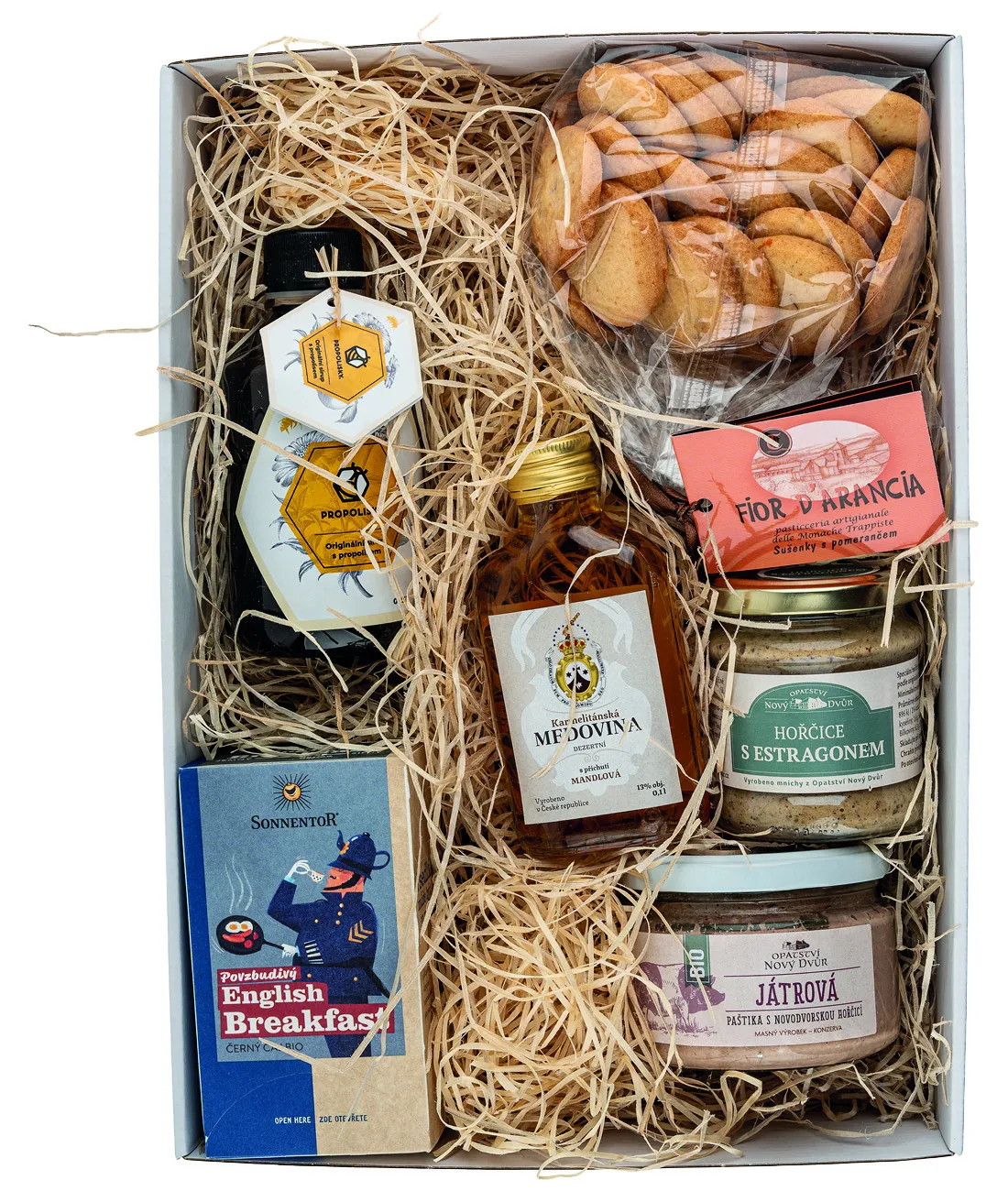 Sada obsahuje: Propolisky - sirup s propolisem 0,25 L (380 g) Karmelitánská medovina - mandlová 13%, 0,1 l. Povzbudivý English Breakfast černý čaj bio, 32,4g, porcovaný, dvoukomorový Játrová paštika s novodvorskou hořčicí 220g Hořčice s estragonem 195g Sušenky Fior d'Arancia 250g