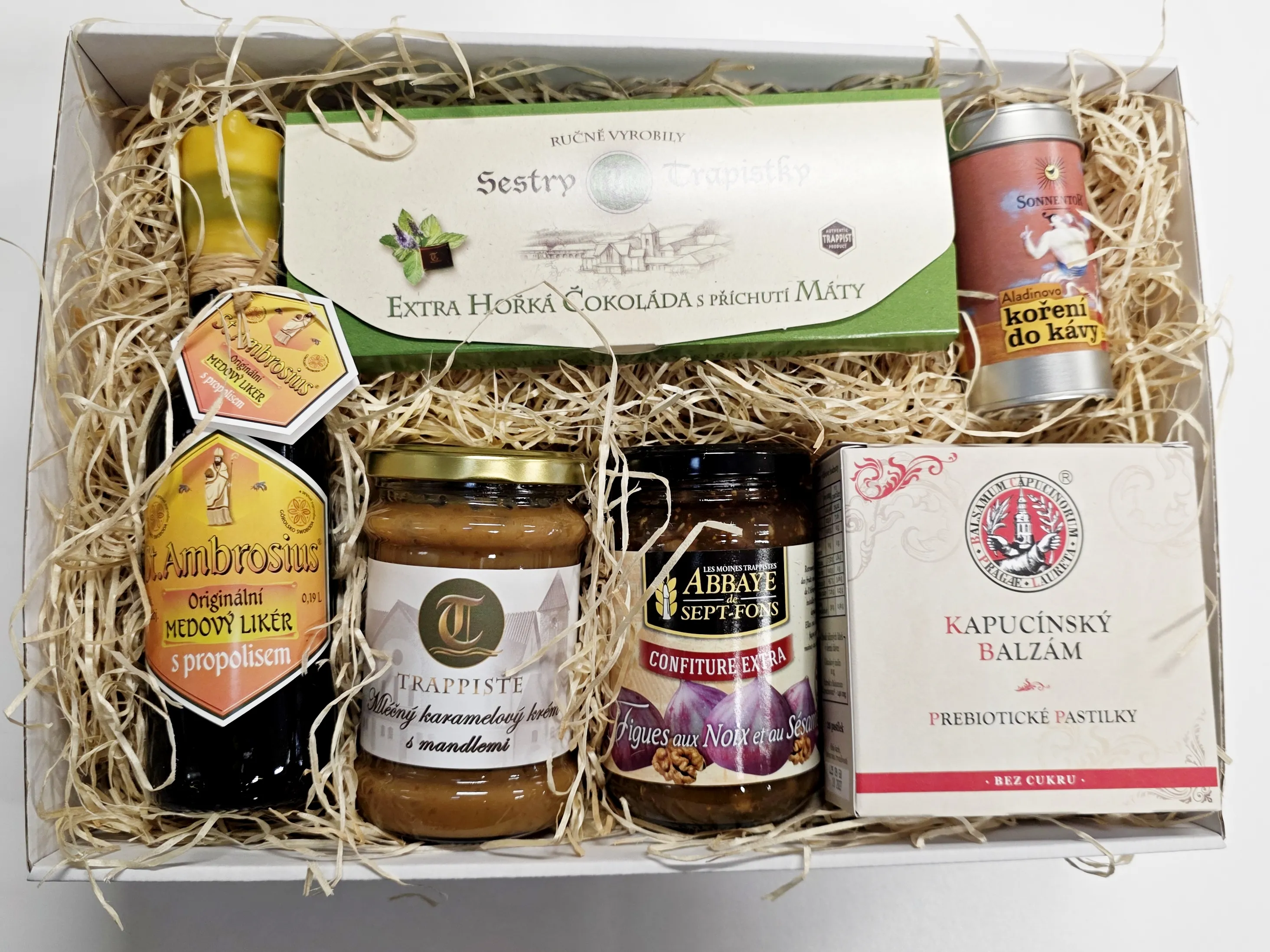 Sada obsahuje: Aladinovo koření do kávy bio 35g dózička Čokoláda extra hořká s mátou 100g Džem - fíky s ořechy a sezamem 370 g Medový likér s propolisem 0,19 l, 36% Mléčný karamelový krém s mandlemi 300g Prebiotikum Kapucínský balzám - benediktinské prebiotikum