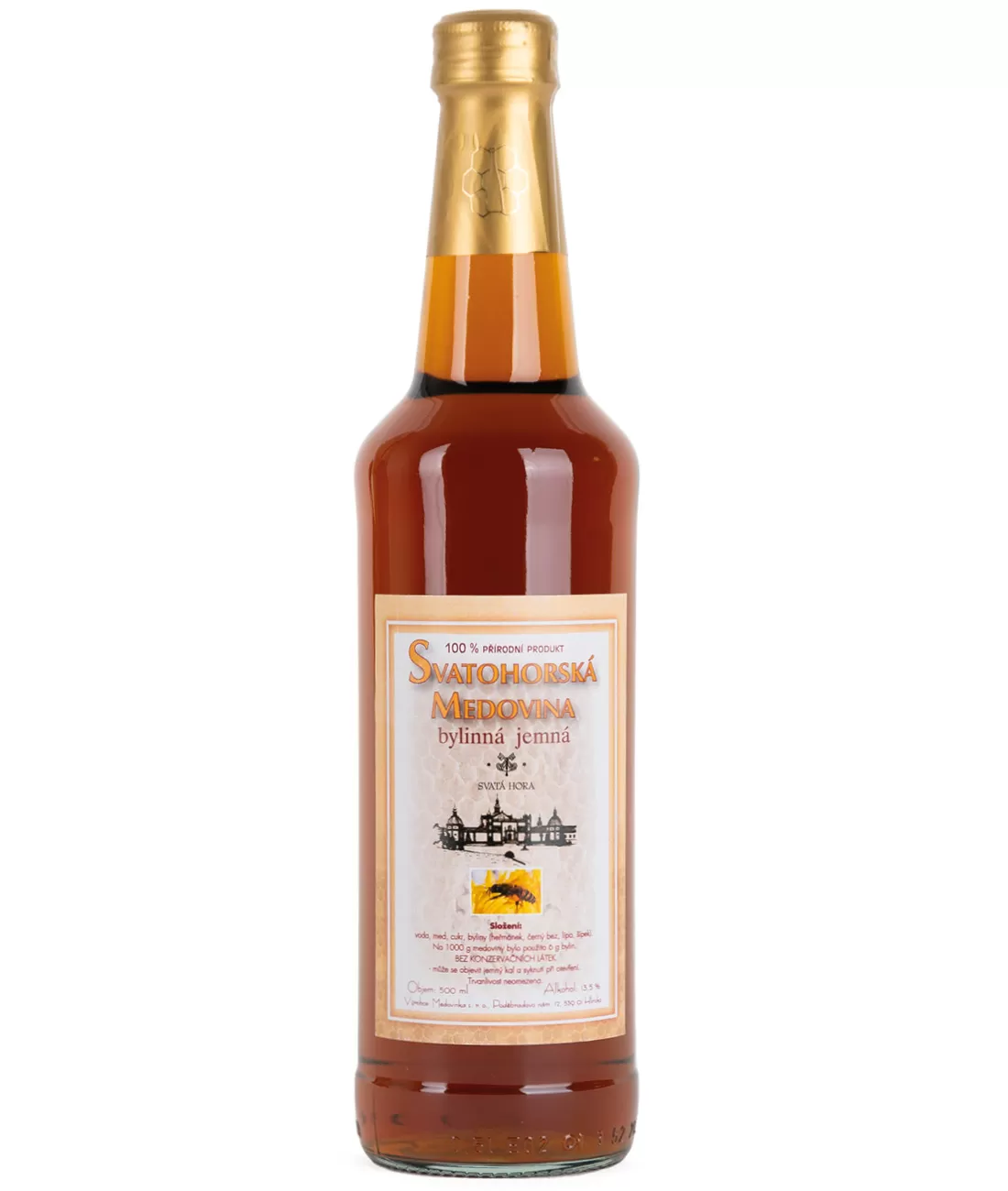 Jemná bylinná přírodní medovina výjimečně lahodné chuti, 0,5 l, 100% přírodní produkt, 13,5 % alkoholu. Medovina nás provází od pradávna. Základem je med, voda a kvasinky. Jemný bylinný odstín Svatohorské medovině dodává výrazně aromatický květ černého bezu sbíraný právě na Svaté hoře.