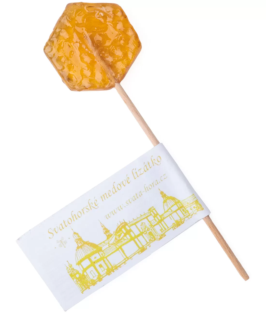 Medové lízátko ve tvaru včelí buňky je vyrobeno z českého medu.