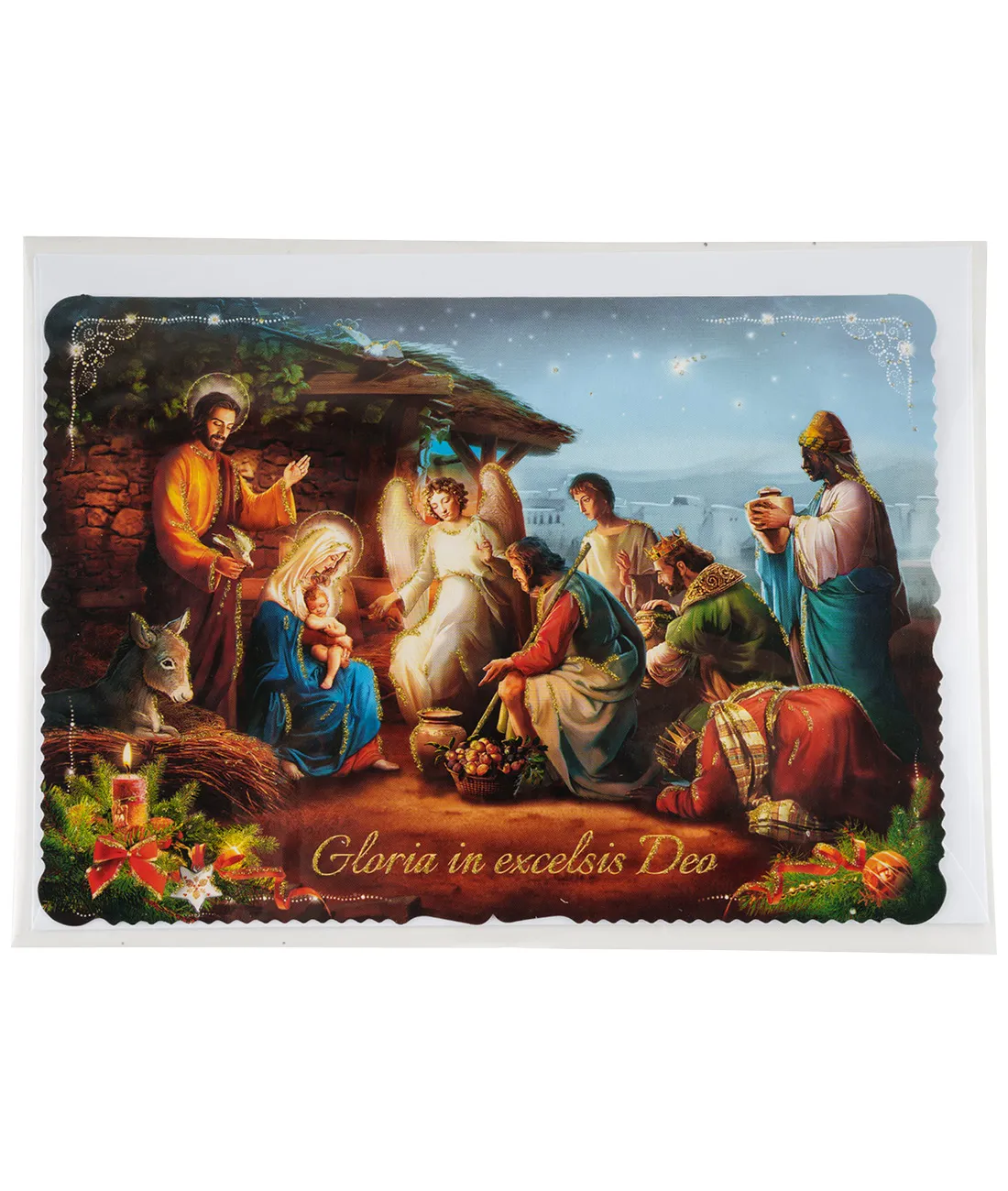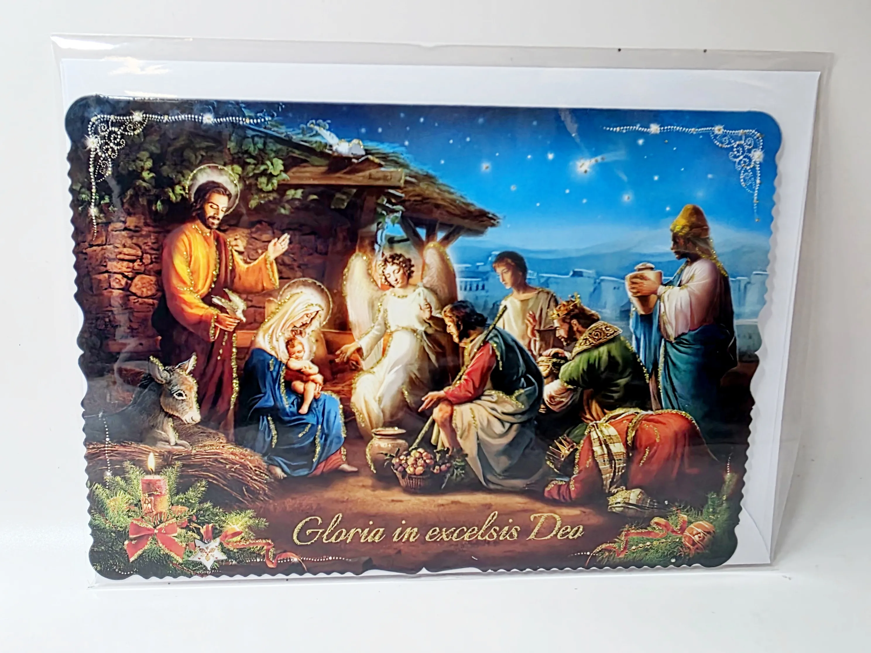 Přání vánoční - betlém a Tři králové, brokát 11,5 x 16,5 cm