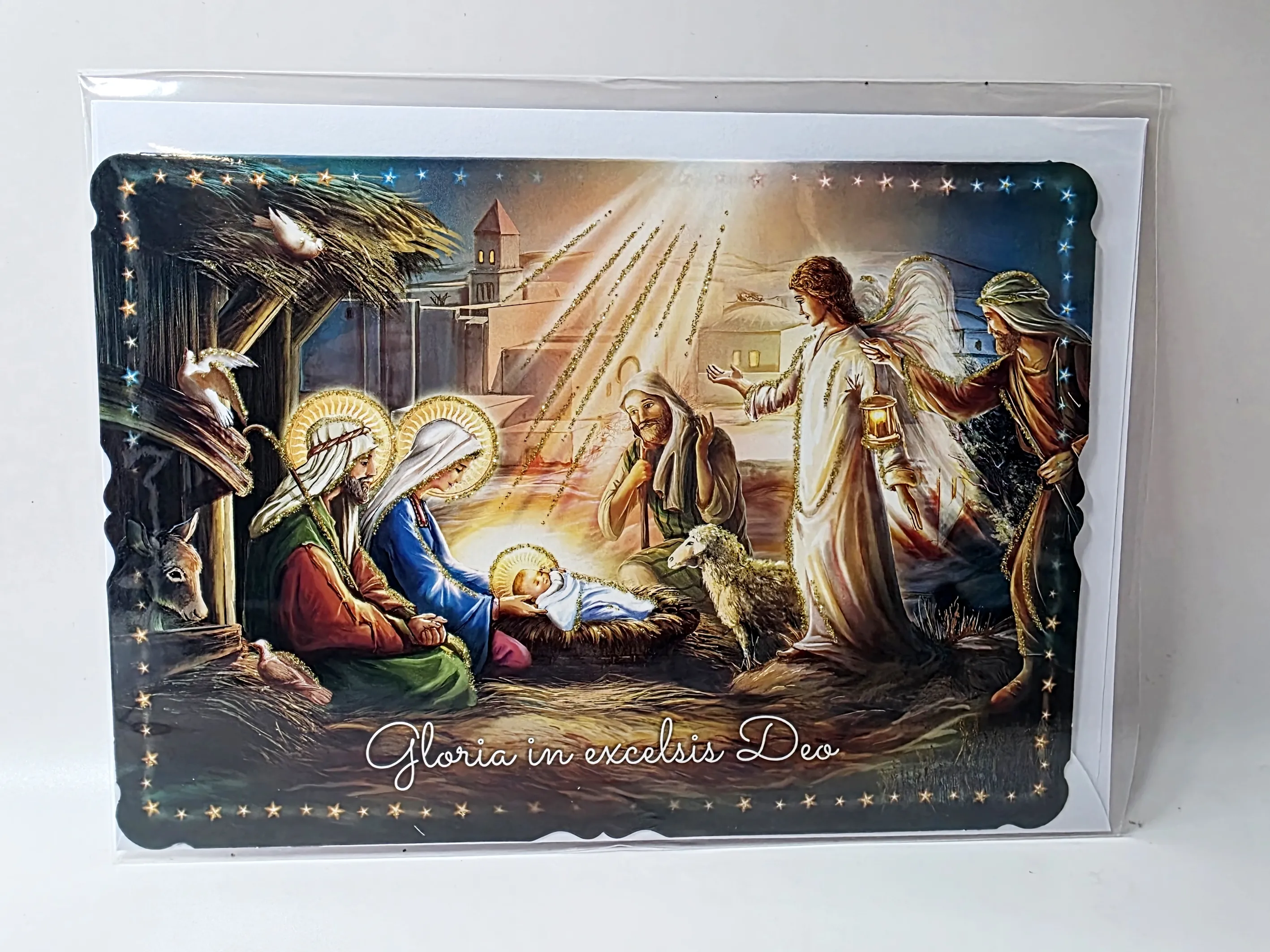 Přání vánoční - betlém s pastýři, brokát) 11,5 x 16,5 cm