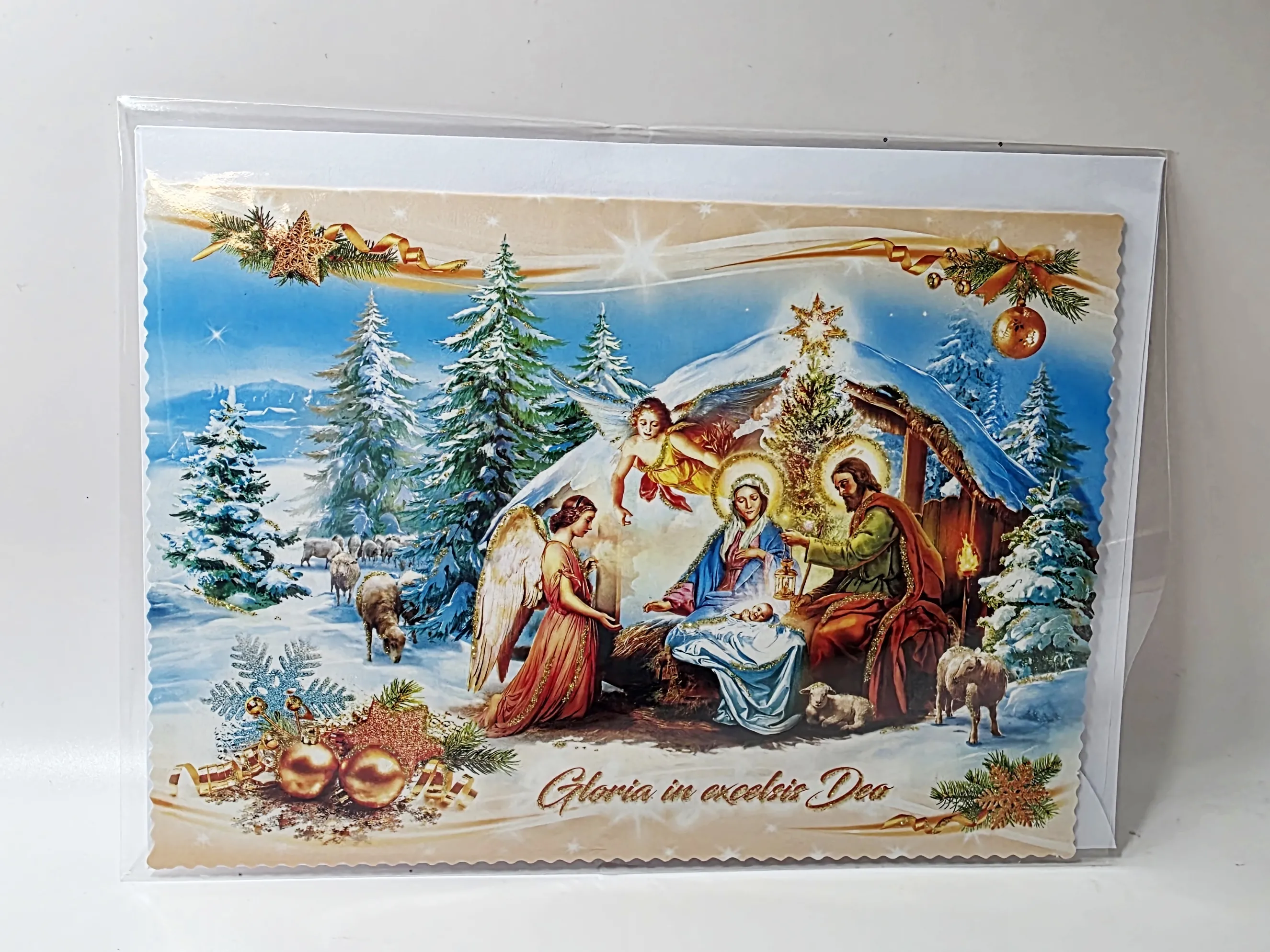 Přání vánoční - betlém, zimní krajina, brokát 11,5 x 16,5 cm