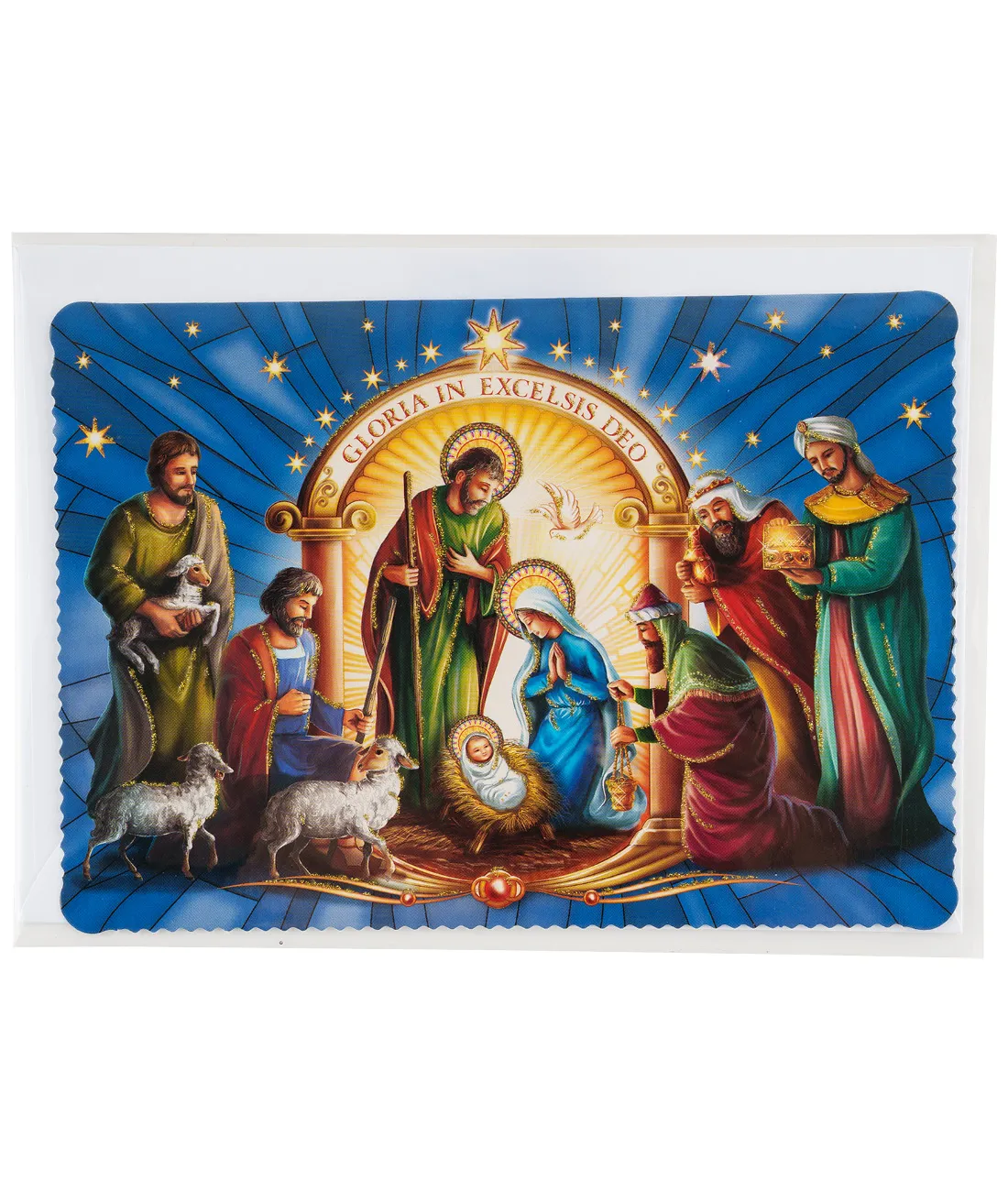 Přání vánoční - Svatá Rodina, Tři králové a pastýři, brokát 11,5 x 16,5 cm
