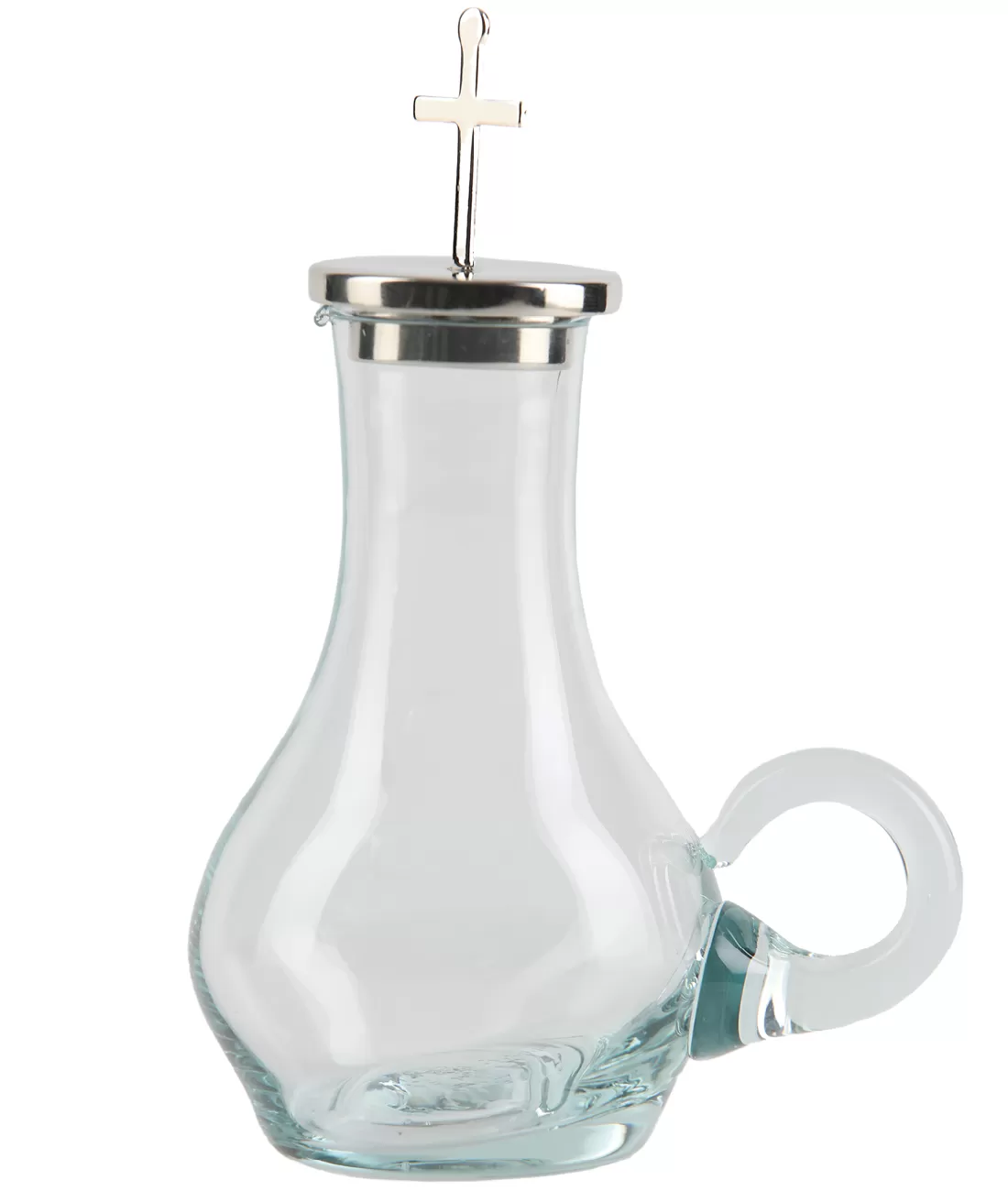 Precizně zpracovaná skleněná mešní konvička se stříbrným víčkem s křížkem. Velká - velikost 11 x 7 cm.