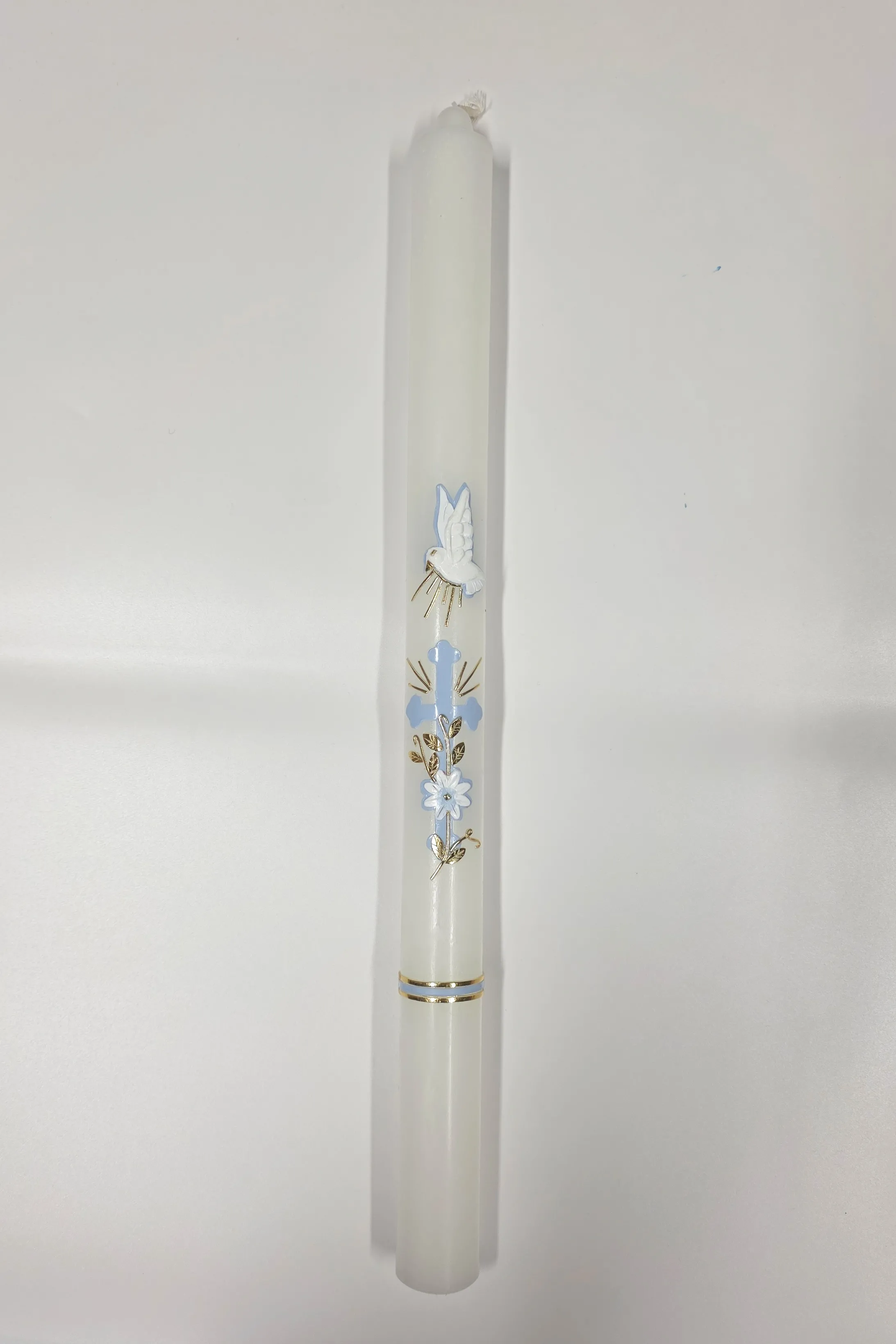 Ručně zdobená svíce křestní nebo k biřmování - modrý kříž a holubice.