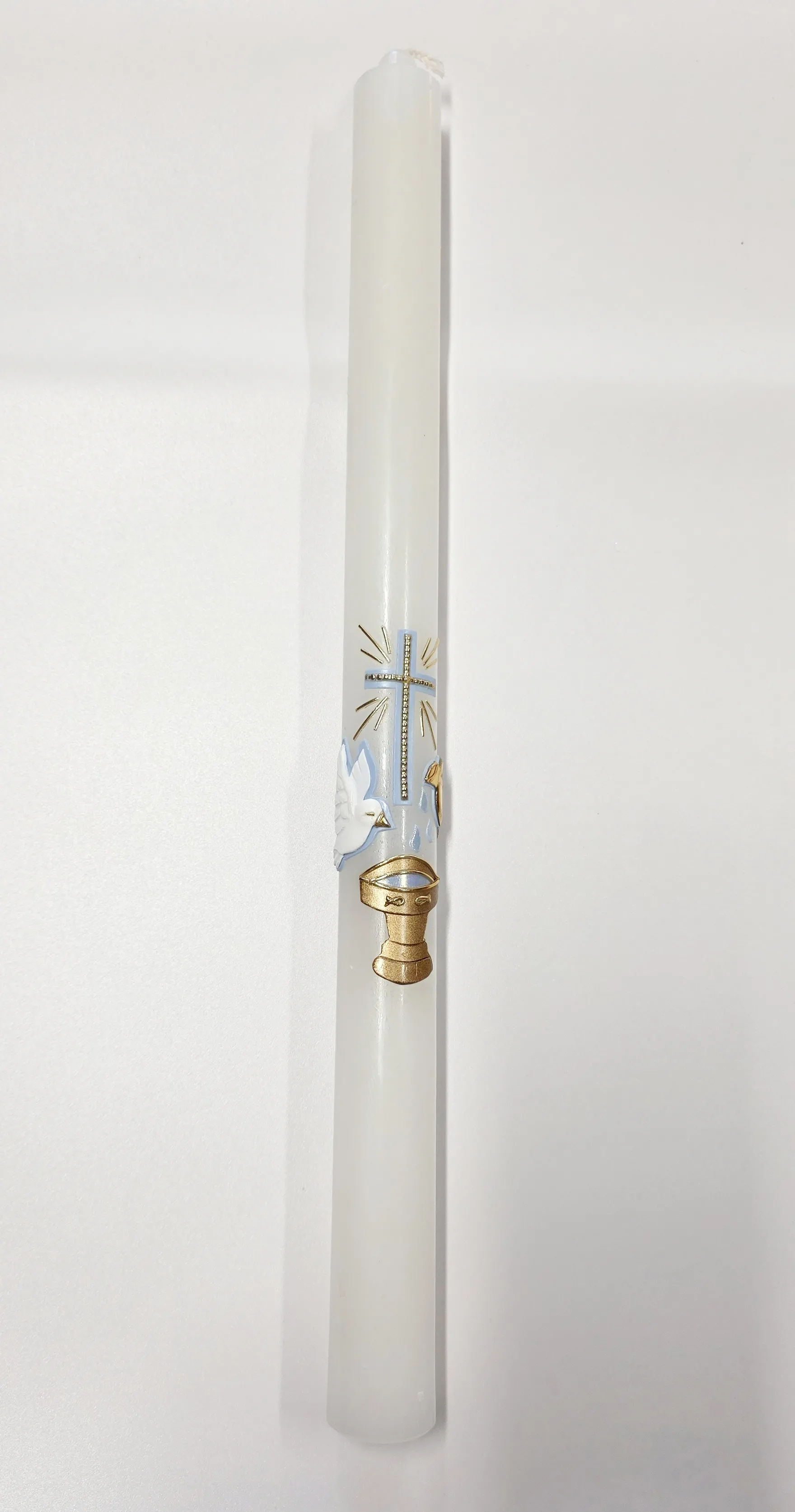 Ručně zdobená křestní svíce s modrým křížem, holubicí a křtitelnicí.