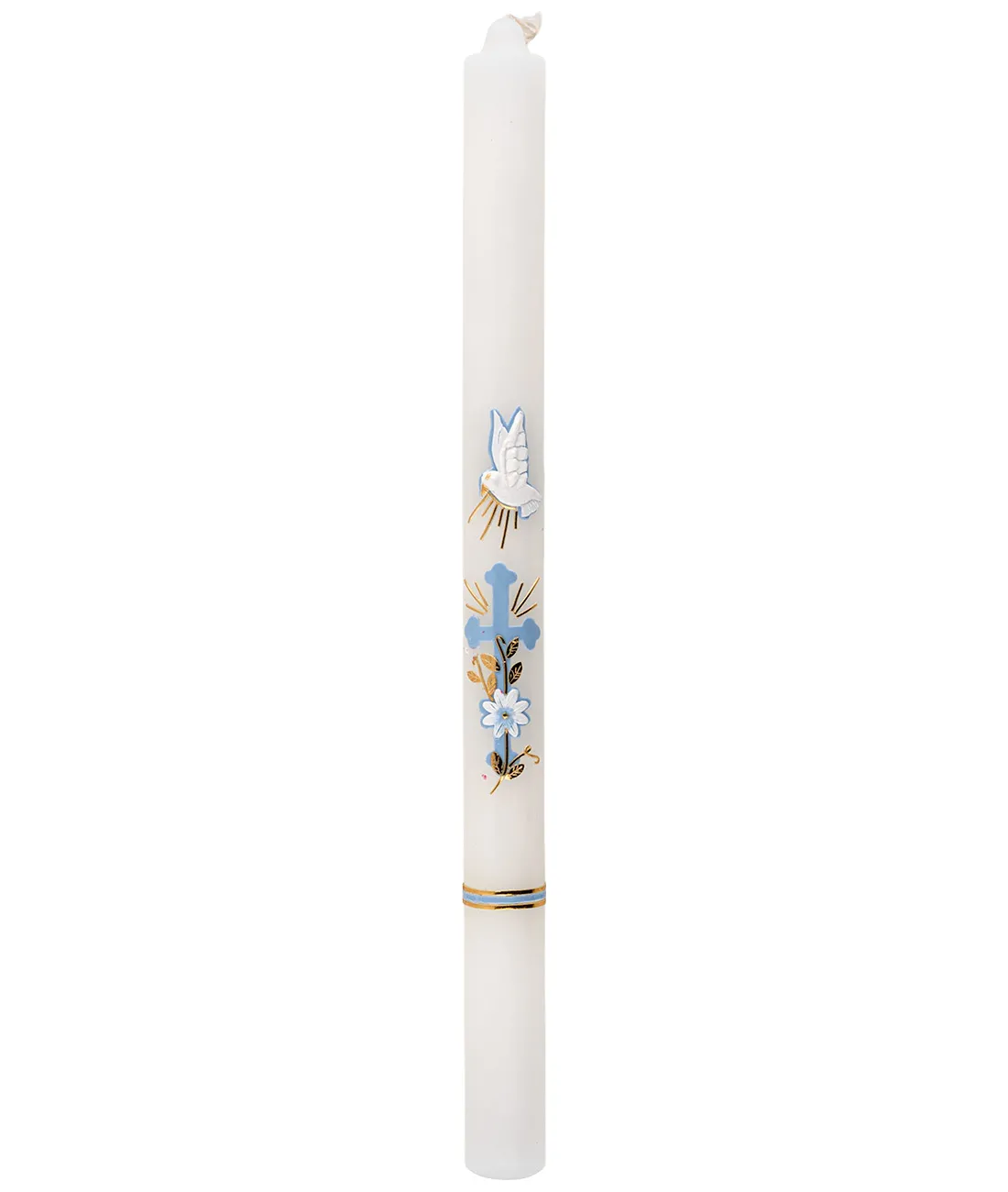 Ručně zdobená svíce křestní nebo k biřmování - modrý kříž a holubice.