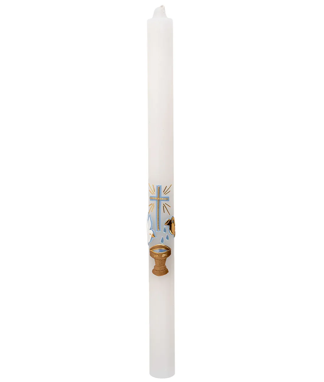 Ručně zdobená křestní svíce s modrým křížem, holubicí a křtitelnicí.
