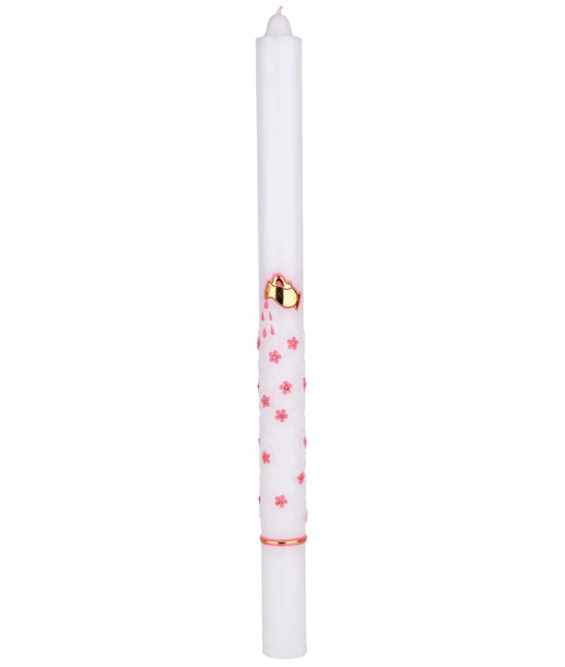 Ručně zdobená křestní svíce s růžovými květy a džbánem.