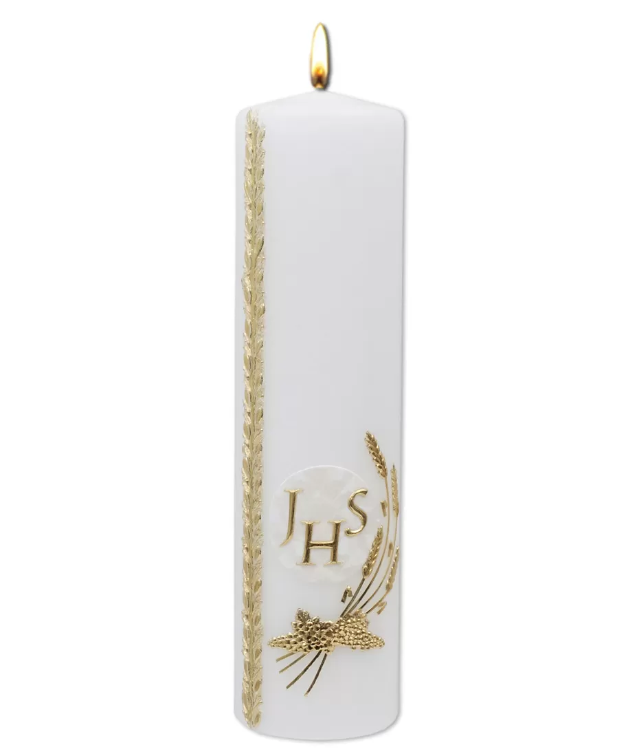 Oltářní svíce s reliéfem révy, klasů a Božího jména.