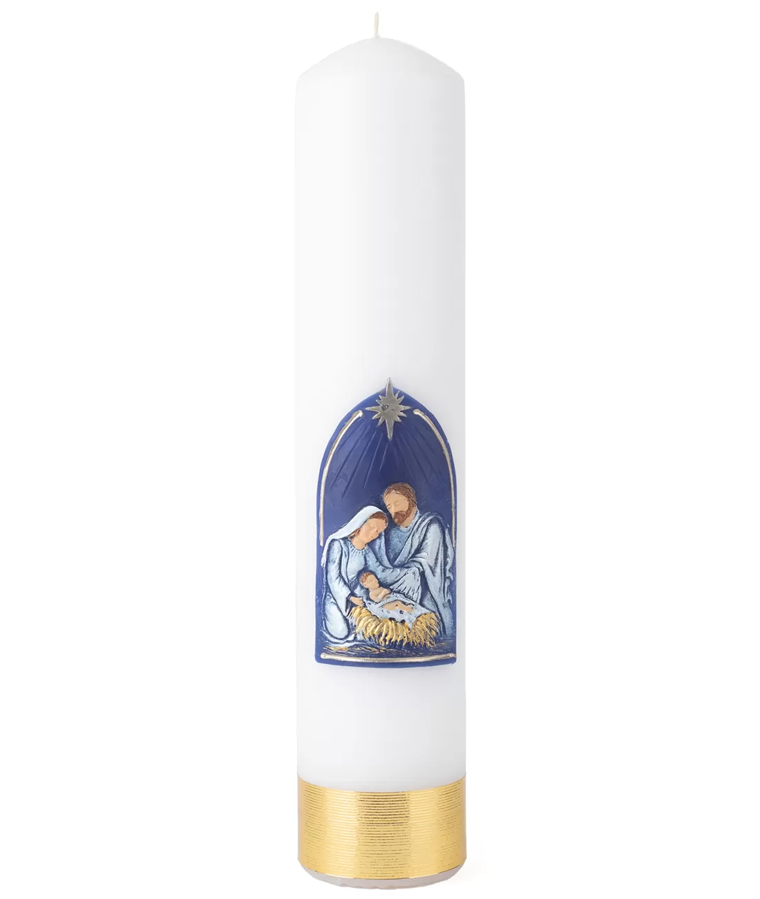 Vánoční svíce s kolorovaným reliéfem Svaté rodiny a páskem zlatavé barvy na konci svíce.