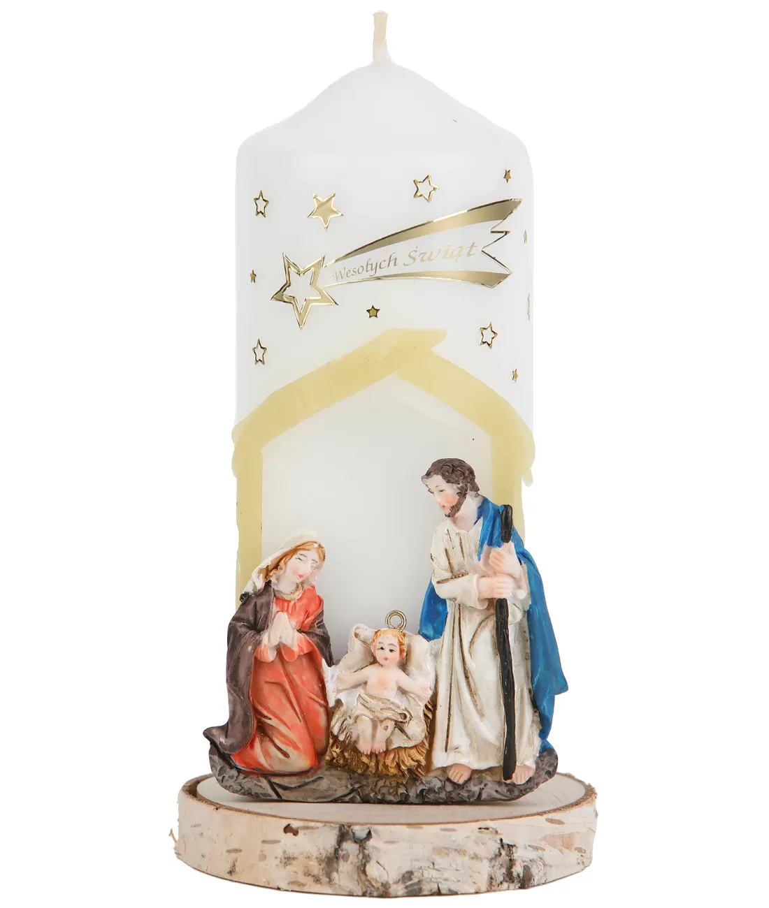 Svíčka s diodou měnící barvy. Dioda se zapíná automaticky po zapálení svíčky a vytváří úžasné vícebarevné světlo. Svíce navíc obsahuje drobnou barevnou plastiku Svaté rodiny, takže máte zároveň vánoční svíčku i betlémek. Výška svíčky je 18 cm a je umístěna na dřevěném podstavci.