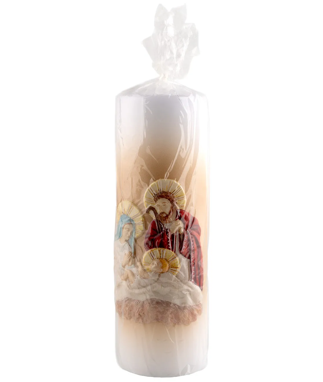 Klasická bílá svíce s barevným reliéfem Svaté rodiny na Váš vánoční stůl. Svíčky jsou vyrobeny ze zdravotně nezávadného parafinu vysoké kvality. Od tradičního českého výrobce.