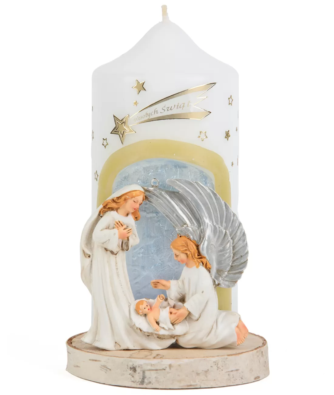 Nabízíme vám nový druh svíce, která je charakteristická tím, že kromě normálního plamene se rozzáří pomocí optického vlákna ve třech se opakujících barvách. Navíc svíci zdobí reliéf Svaté rodiny s klečícím andělem, takže máte zároveň vánoční svíci i betlémek.