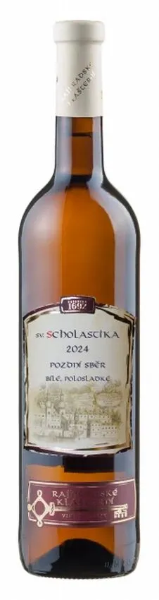 Sv. Scholastika je patronkou obce Rajhradice. Je dvojčetem sv. Benedikta, který je patronem Evropy a zakladatelem řádu benediktinů, s nímž je spjata historie rajhradského vinařství od samého počátku. Víno je vyrobeno většinovým podílem z odrůdy Müller Thurgau. Víno zlatavé barvy má vůni sušených květin a v chuti se kombinují čajovo medové tóny zakončené příjemnou kyselinkou.